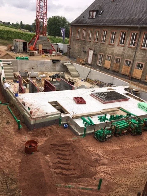 Nach den Erd- und Leitungsarbeiten schreiten die Rohbauarbeiten voran und das neue Hörsaalgebäude von SSP Architekten im Innenhof des Schlosses nimmt seine Form an. TGP Landschaftsarchitekten freut sich auf die Umsetzung der Freianlagen im Schlossumfeld als 1. BA der Neugestaltung des Campus der EBS Universität in Oestrich-Winkel am Rhein.